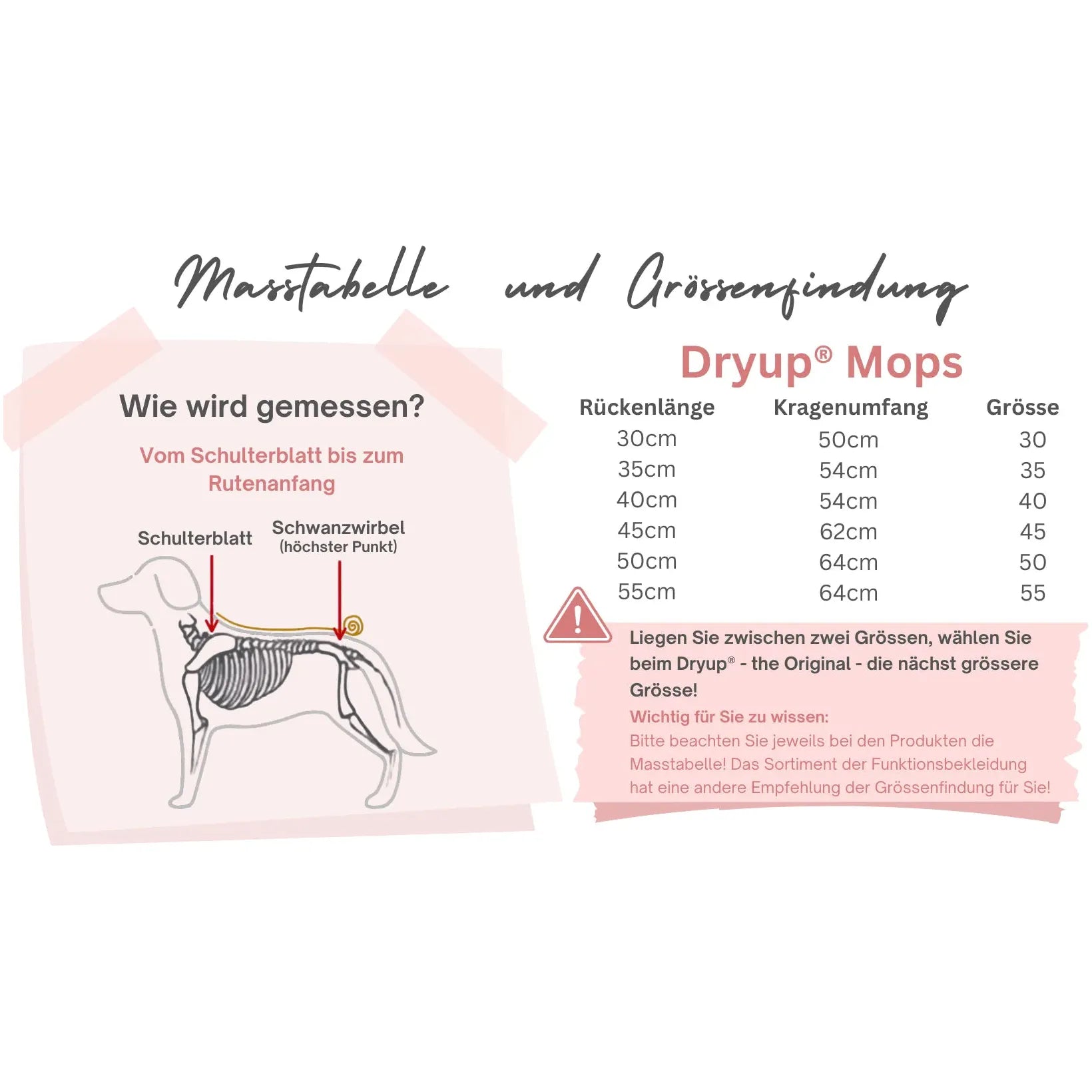 Bitte messen Sie die Rückenlänge Ihres Hundes vom Schulterblatt bis zum Rutenansatz. Liegt die Rückenlänge zwischen zwei Grössen, wählen Sie die nächstgrössere Variante.