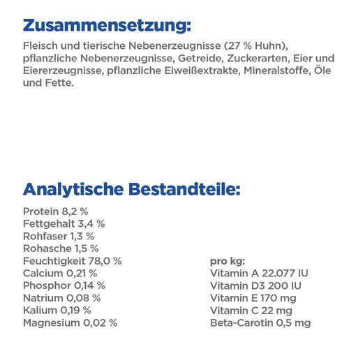 Fleisch und tierische Nebenerzeugnisse (27 % Huhn), pflanzliche Nebenerzeugnisse, Getreide, Zuckerarten, Eier und Eiererzeugnisse, pflanzliche Eiweißextrakte, Mineralstoffe, Öle und Fette.